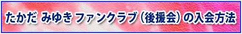 ☆ たかだみゆきを応援しようと思われている方なら誰でも ご入会していただけます。 ご登録いただくと、所属事務所からファンクラブ(後援会)への 入会案内が送られてきますので、それに従ってご入会ください。☆ ご登録いただきますと タレント活動のご案内 その他の情報などが 所属プロダクションから 郵送などによって届きます。 ☆ 下記の〔登録する〕をクリックすると あなたの 申し込み資料が 所属プロダクションに送信され ファンクラブ(後援会)に登録されます。