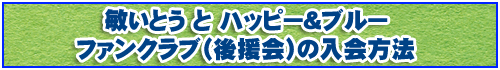 ☆ 敏いとう と ハッピー&ブルーを応援しようと思われている方なら 誰でもご入会していただけます。 ご登録いただくと、所属事務所からファンクラブ(後援会)への 入会案内が送られてきますので、それに従ってご入会ください。☆ ご登録いただきますと タレント活動のご案内 その他の情報などが 所属プロダクションから 郵送などによって届きます。 ☆ 下記の〔登録する〕をクリックすると あなたの 申し込み資料が 所属プロダクションに送信され ファンクラブ(後援会)に登録されます。